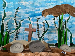 Passend zur Jahreslosung ist Otis bei uns eingezogen. Otis ist ein junger Otter, Er findet, dass Steine besonders praktisch sind. Man kann mit ihnen Muscheln knacken und jonglieren. Doch leider ist Otis noch zu klein und kann nicht tauchen. Wie soll er sich jetzt seinen eigenen Stein suchen? Und wenn er Steine findet, welcher ist dann der Beste für ihn? – Beim Schwimmen im Meer entdeckt Otis eine Flaschenpost mit der Nachricht: Auftrag von Gott: Du darfst alles prüfen und das Gute behalten.